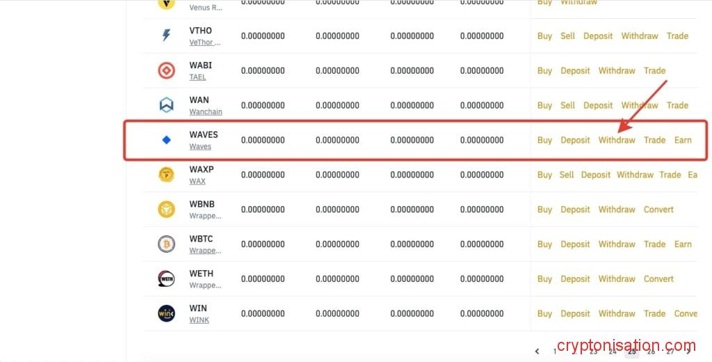 - В списке найдите WAVES (или воспользуйтесь строкой поиска) и нажмите Withdraw;