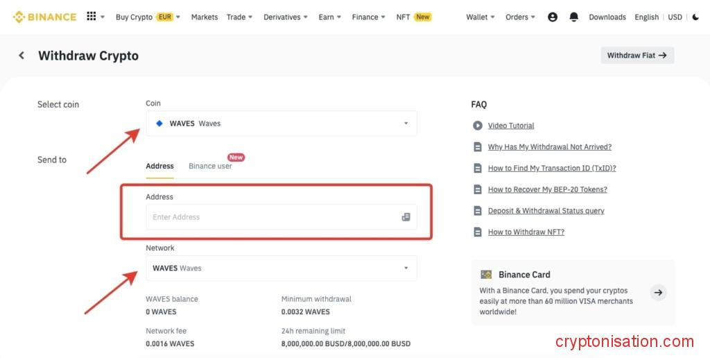 Покупка WAVES за евро - Далее потребуется указать адрес кошелька для отправки WAVES и сеть;
