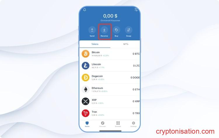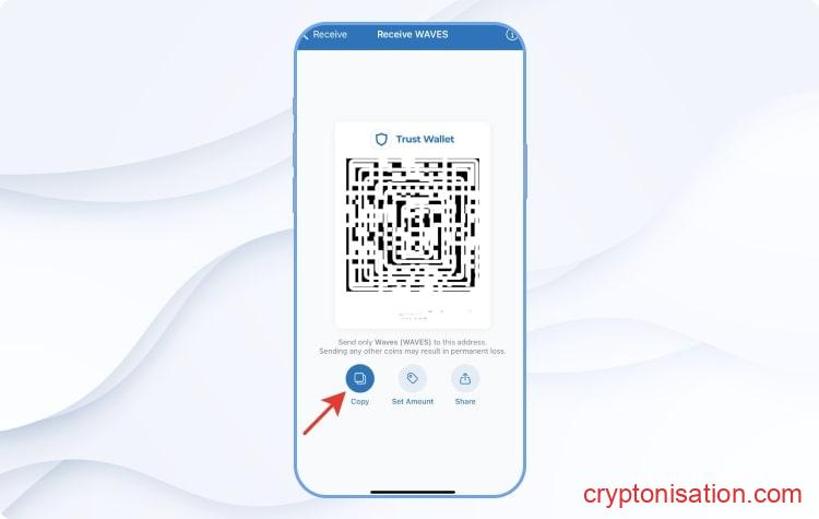 Адрес для вывода WAVES с биржи Binance - Адрес для перевода монет можно получить непосредственно в кошельке: открываем приложение Trust Wallet, установленное на мобильное устройство, и жмем Receive;