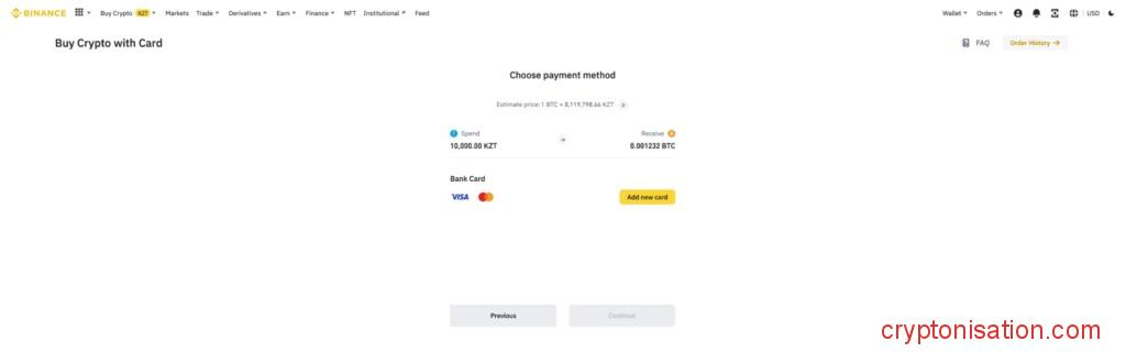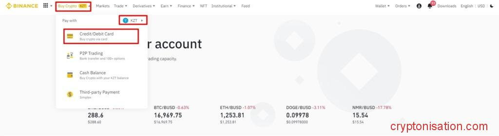 - Откройте вкладку Buy Crypto, выберите KZT → Credit/Debit Card;