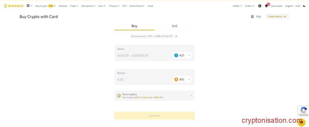 Покупка BTC c с карты - Укажите сумму тенге и нажмите Continue;