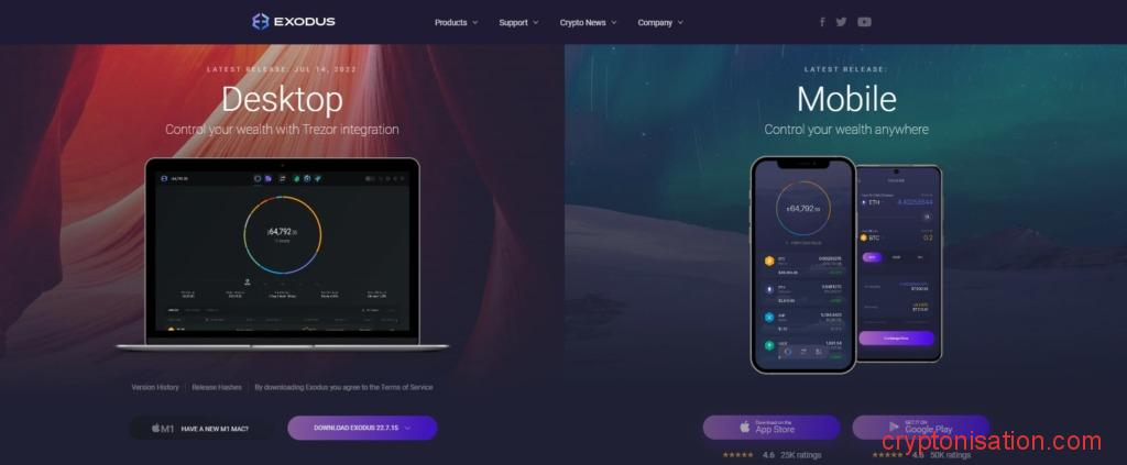 - На официальном сайте Exodus перейдите на страницу загрузки дистрибутива → выберите мобильный или десктопный вариант установки (далее рассматривается десктопный вариант);