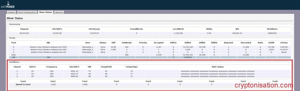 - Терахэши и градусы. При повышении температуры чипы майнинговых плат теряют производительность и начинают чаще ошибаться в расчетах. Каждая модель ASIC-майнера имеет свой уровень оптимальной температуры работы. Для Antminer S9 идеальная температура помещения, где работает майнер – не более 30°C градусов. Температура нагрева чипов – до 80°C градусов, плат – 45-50°C. Текущая температура элементов устройства отображается в разделе Miner Status → поле Antminer;