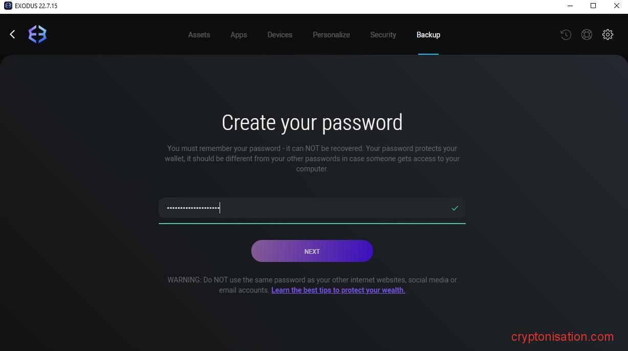 - Запустите кошелек, перейдите в меню Settings → Backup → Exodus Password. Следуя указаниям, создайте пароль и сид-фразу;