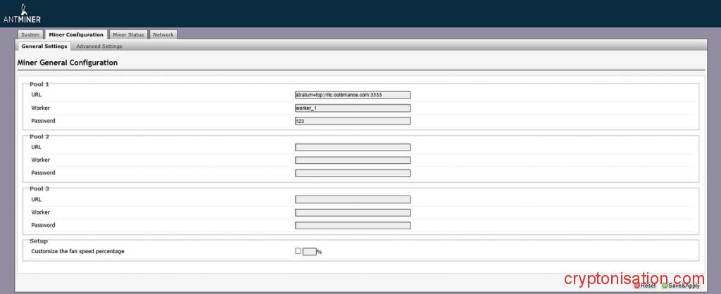 Когда информация из пула внесена в интерфейс Antminer, можно начинать майнинг. Для этого нажмите на кнопку Save and Apply в правом нижнем углу страницы General Settings в интерфейсе майнера. Майнер начнет добычу в течение пары минут после сохранения данных (в Binance Pool пауза до начала добычи будет длиться примерно 10 минут)💰.