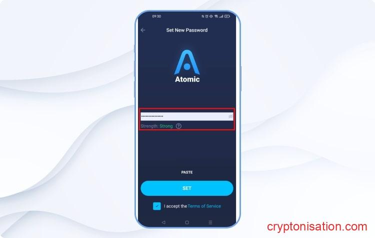 Окно создания нового кошелька - Придумайте и подтвердите пароль для вашего аккаунта в Atomic Wallet;