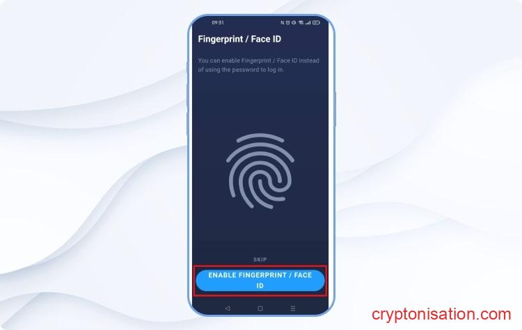Окно создания пароля - Нажмите Enable fingerprint/Face ID, если хотите входить в приложение с помощью сканера отпечатка пальца или лица;