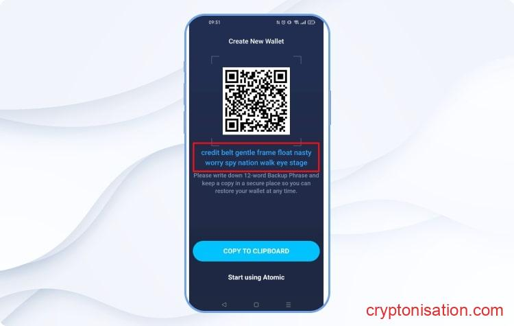 Окно защиты аккаунта биометрией - Вы увидите свою сид-фразу. Сохраните ее в надежном месте и нажмите Start using Atomic → кошелек создан.