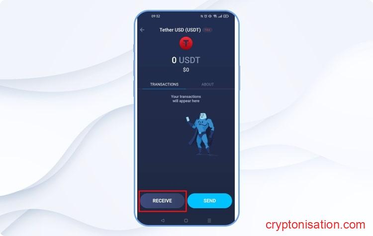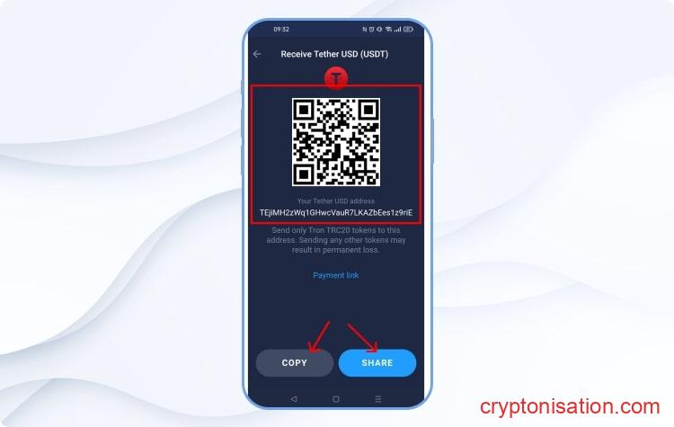 Экран транзакций USDT Tron - Вы увидите QR-код и адрес вашего кошелька. Скопируйте адрес и отправьте его пользователю, который хочет сделать вам перевод. Можно также отсканировать QR-код.