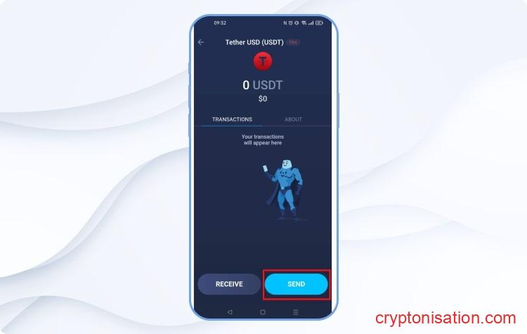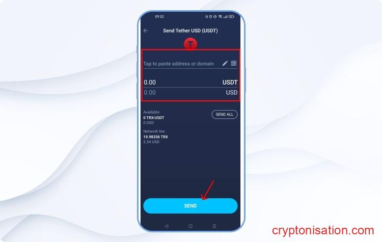Экран транзакций USDT TRC-20 - Введите адрес кошелька получателя и сумму, которую вы хотите отправить;