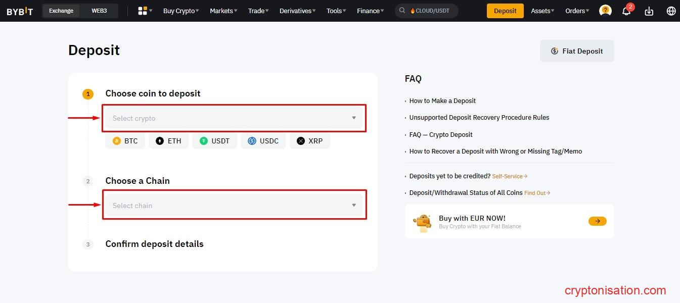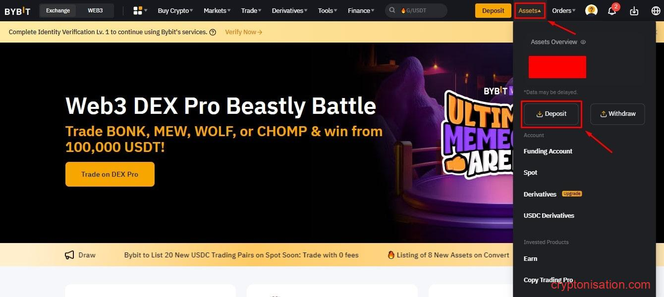 - Для начала необходимо скопировать адрес TON на криптобирже. Для этого в личном кабинете биржи ByBit перейдите в меню Assets и выберите раздел Deposit;