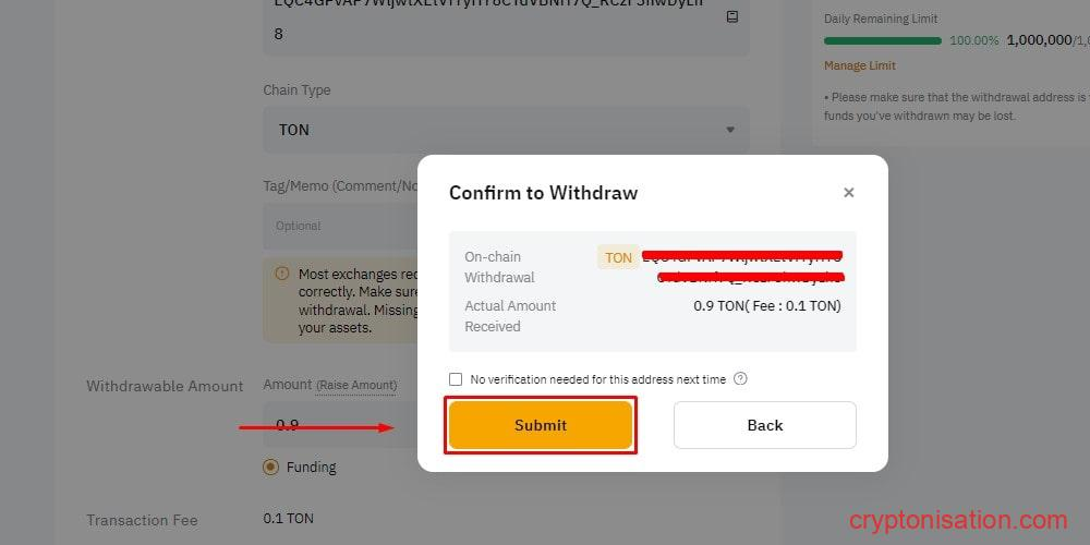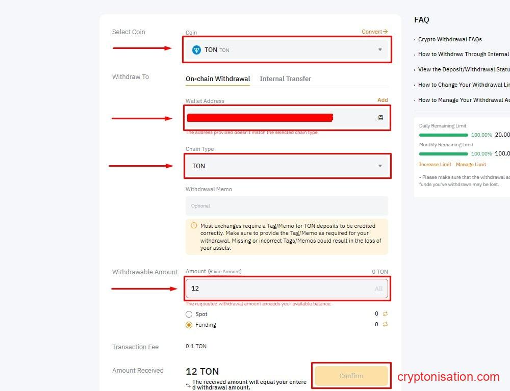 - В открывшейся форме в первом поле (Select Coin) необходимо выбрать из списка монету TON. В окне Wallet Address вставьте ранее скопированный адрес кошелька Tonkeeper и выберите сеть (Chain Type) TON. Далее введите сумму перевода в окне Amount и подтвердите операцию → Confirm;