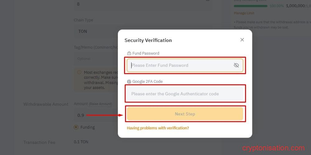 - На последнем этапе подтвердите перевод, введя пароль и код двухфакторной аутентификации (2FA). Далее выберите Next Step → Confirm.