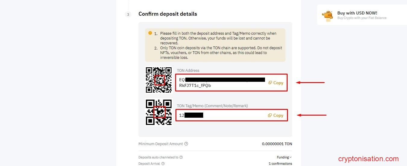 - Далее появится адрес, на который необходимо отправить крипту. Некоторые платформы указывают еще и параметр Tag/Memo, который также необходим при переводе, если его запрашивает сервис;