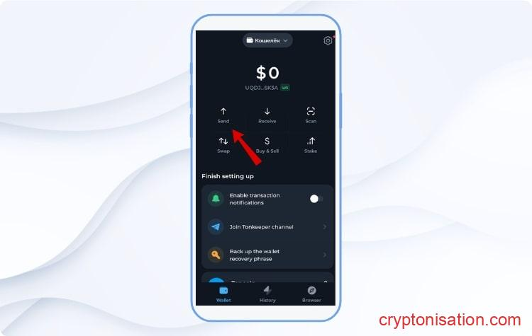 - Далее откройте кошелек Tonkeeper и выберите раздел Send;