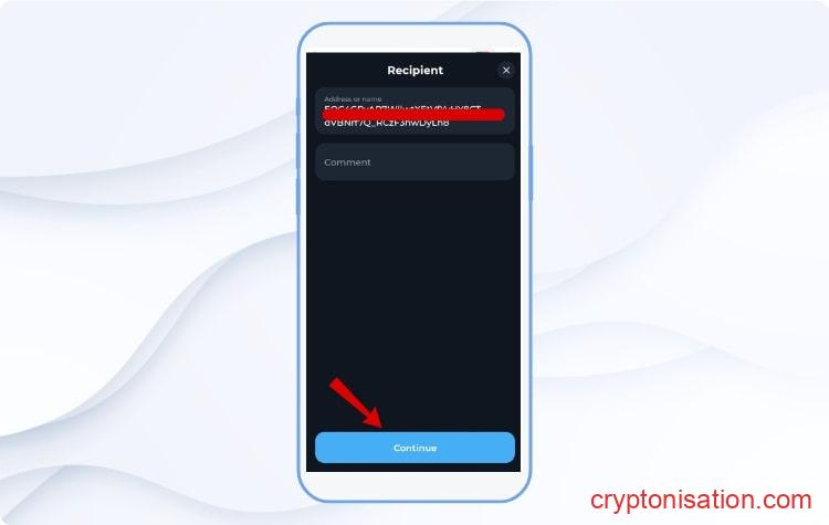 - В поле Address or name вставьте скопированный адрес с биржи ByBit и нажмите Continue;