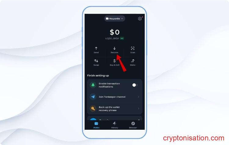 - Откройте криптокошелек Тонкипер и выберите пункт Receive;