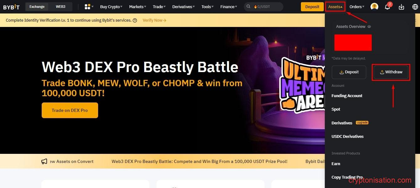 - Далее перейдите на биржу ByBit и в меню Assets выберите Withdraw;