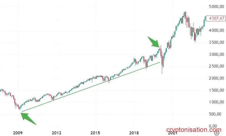 Например, в период с марта 2009 года по февраль 2020 года, stock market США находился в bull market после глобального финансового кризиса. Индекс S&P 500 увеличился более чем на 400% за это время, при этом став индикатором устойчивого улучшения экономики и роста корпоративных прибылей (см. Месячный график S&P 500).