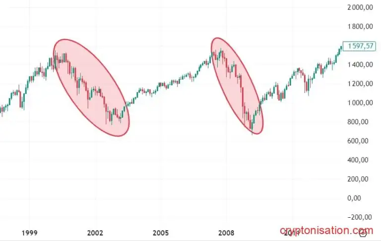 Другой пример — bear market, произошедший в начале 2000-х годов после краха dotcoms. Индекс NASDAQ упал более чем на 70% от своего пикового значения, что привело к значительным убыткам для инвесторов (См. Месячный график S&P 500)