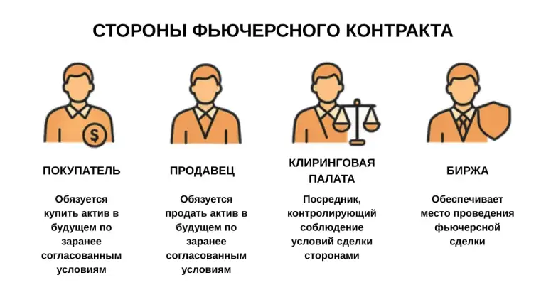 Сторонами фьючерсного контракта являются покупатель и продавец. В роли гаранта для классического рынка фьючерсов выступает клиринговая палата. Местом проведения сделки является биржа. Эти участники выполняют следующие операции: