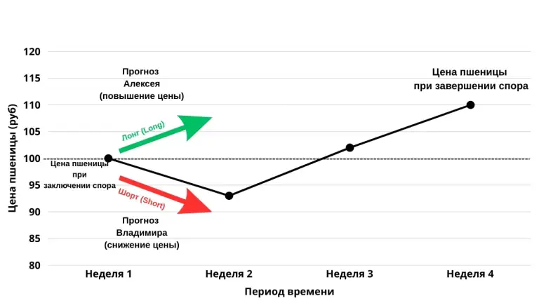 Алексей считает, что цена пшеницы вырастет через месяц, а Владимир – что она снизится. Они заключают пари. На момент заключения спора стоимость пшеницы на рынке составляет 100 руб за кг.