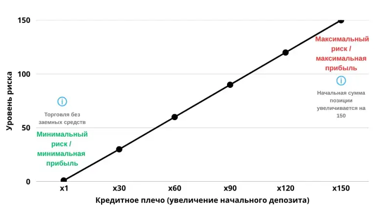 Кредитное плечо (Leverage) позволяет открывать позицию с более крупной суммой, чем есть на балансе трейдера. Например, при начальной марже $10 кредитное плечо x10 увеличивает позицию до $100, плечо размером x100 – $1000 и так далее. Прибыль, убыток и комиссии будут рассчитываться исходя из полной стоимости позиции, а не первоначальной маржи.