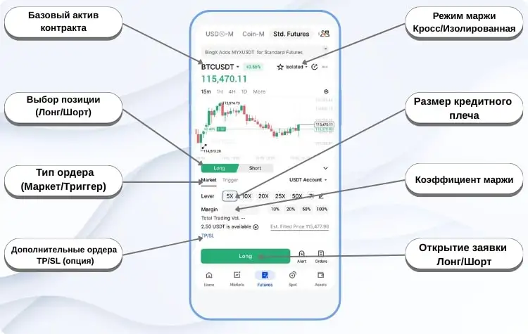 - Изолированная (Isolated Margin) – для одной позиции выделяется фиксированная сумма с общего счета. В случае ликвидации позиции убыток ограничен только этой суммой. Такой вариант подходит для сделок с повышенным риском, где важно заранее ограничить возможные потери;