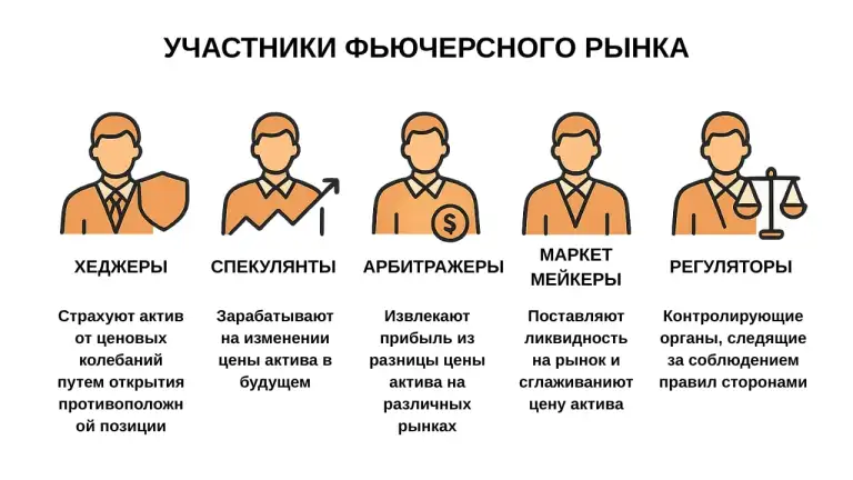 Основные участники фьючерсного рынка – это хеджеры, спекулянты, арбитражеры, маркет-мейкеры и регуляторы.