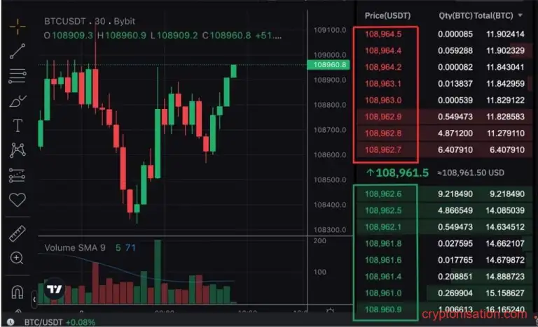 Рыночные приказы можно увидеть в книге ордеров, которую также называют биржевым стаканом. На скриншоте ниже красным цветом показаны заявки, по которым пользователи биржи готовы продать биткоин. Ордера на покупку имеют зеленый цвет. Поскольку биткоин — высоколиквидный актив, то есть всегда имеется большое количество заявок в биржевом стакане, разница цен в заявках на покупку и продажу минимальная.