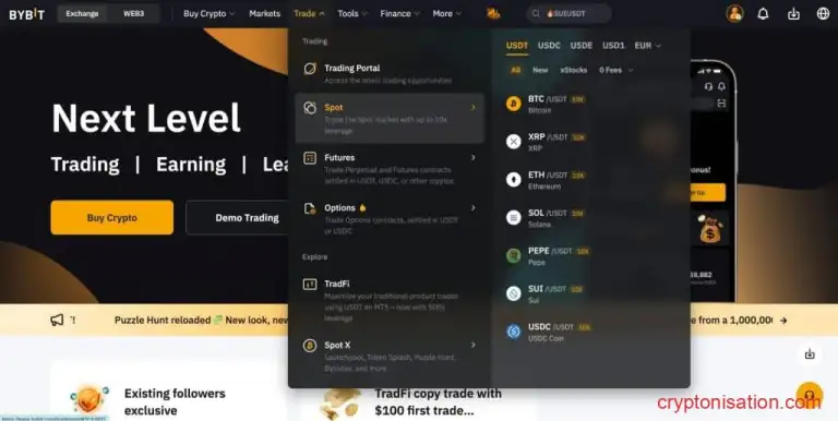 - Находясь на главной странице, выберите пункт меню «Spot» из раскрывающегося списка «Trade»;
