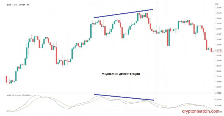 - При медвежьей дивергенции трейдеры могут рассматривать это как сигнал для продажи. Это сигнализирует о том, что восходящий тренд может ослабевать, и существует вероятность незначительной коррекции вниз или смены торговой тенденции.