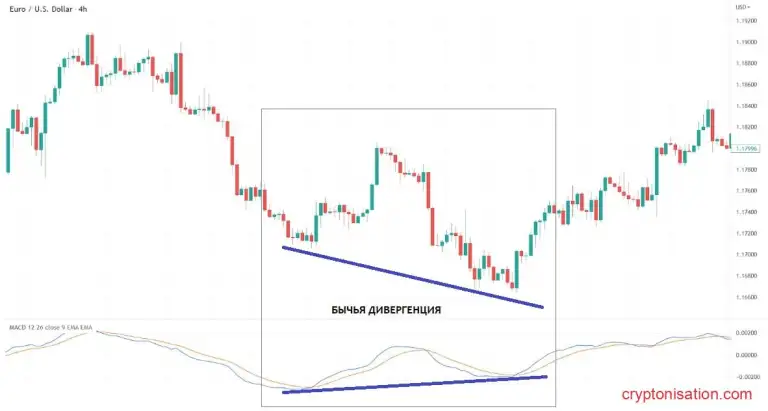- Когда возникает бычья дивергенция (конвергенция), трейдеры могут рассматривать это как сигнал для покупки актива. Это особенно актуально, когда цена актива находится на низком уровне и начинает проявляться слабость нисходящего тренда;
