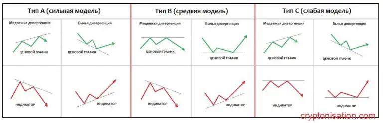Дивергенция может быть разделена на несколько типов в зависимости от того, что происходит с ценой актива и техническим индикатором. Классическая дивергенция и конвергенция, в зависимости от силы сформировавшихся сигналов делится на три типа: