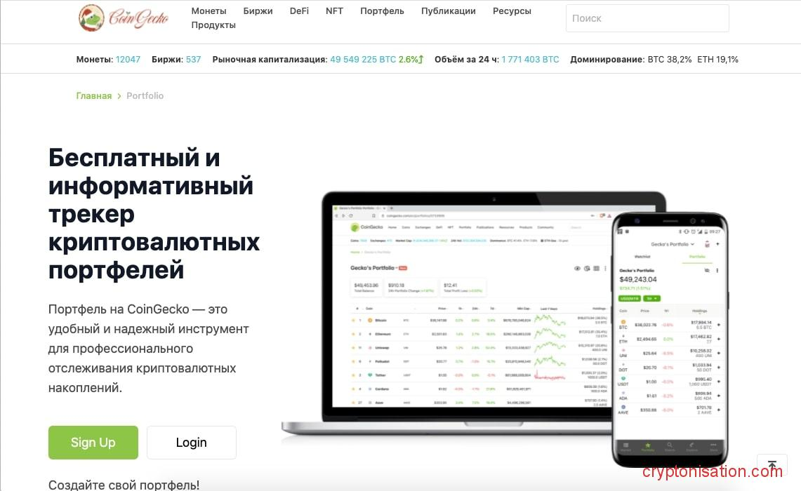 - Трекер криптопортфеля от ведущего сервиса по отслеживанию цен на криптовалюты;