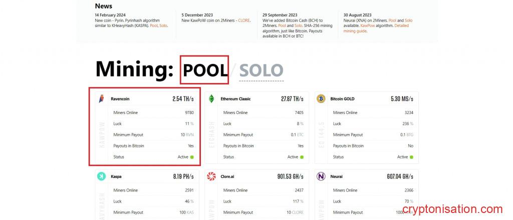 - В разделе Mining на главной странице сайта найдите RVN, переключитесь в режим Pool и кликните по карточке монеты;