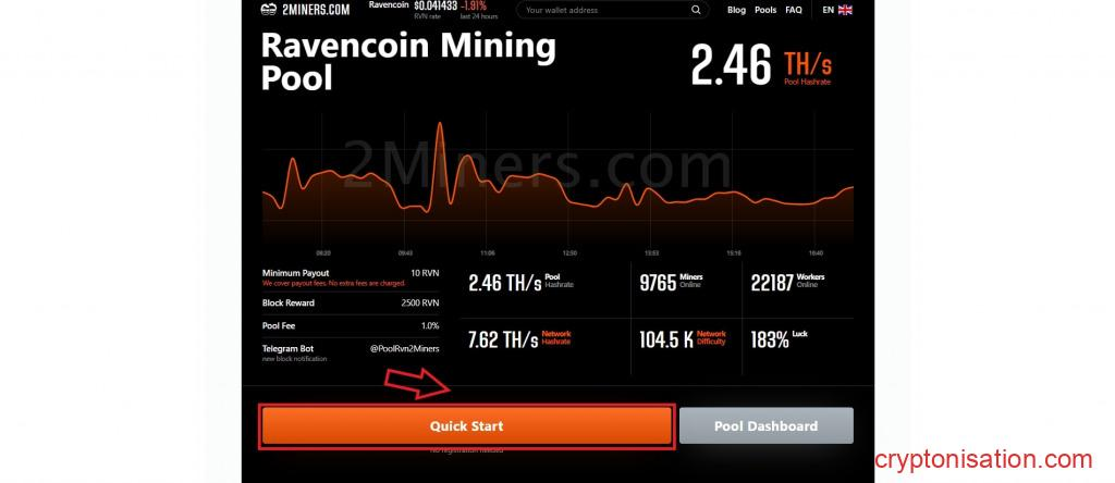 Выбор RVN в качестве монеты для майнинга - Кликните Quick Start;