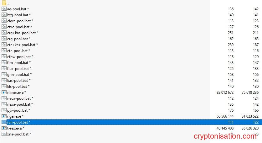 Майнер в папке с майнерами и bat-файлами - Теперь нужно настроить файл config, чтобы подключить майнер к майнинг-пулу. В архивной папке с преднастроенными майнерами он имеет вид исполняемого файла с расширением .bat (в папке с распакованным архивом может выглядеть как просто rvn-pool, если у вас не установлено отображение расширений файлов). Для добычи RVN необходимо внести изменения в rvn-pool.bat;