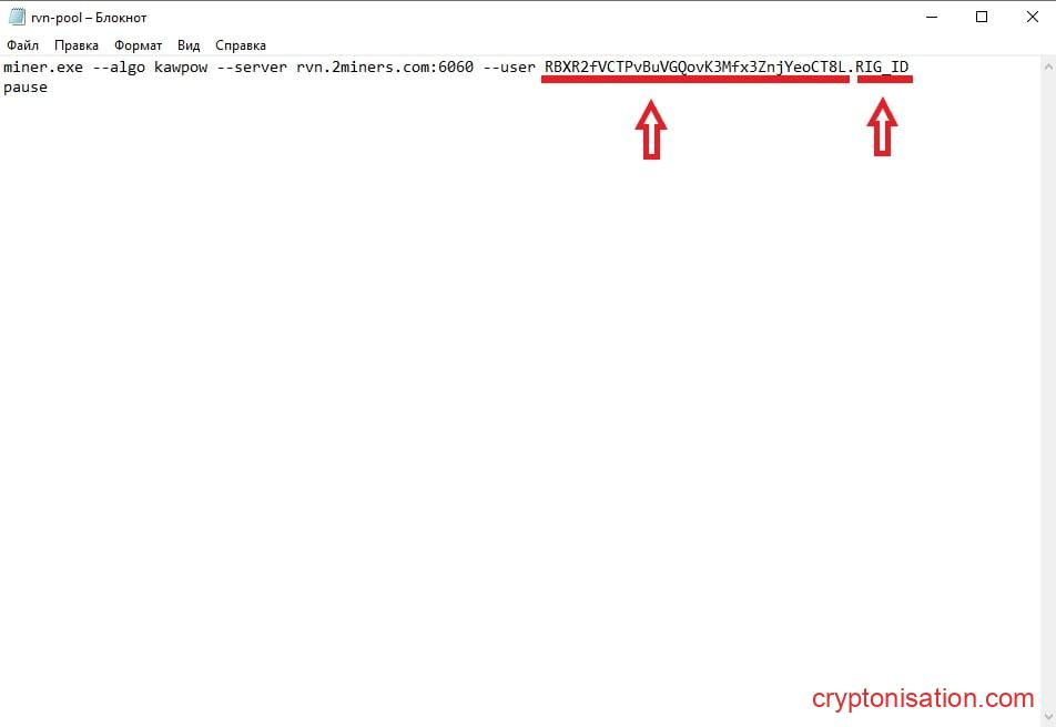 - Введите адрес своего кошелька после команды —user до символа точки (user и адрес кошелька должны быть отделены пробелом). После точки по желанию можно ввести ID воркера (до 32 символов). Если имя воркера будет введено, то оно будет отображаться после запуска майнера в разделе Miners Online. Если оставить после точки строку RIG_ID, то в разделе Miners Online будет отображаться адрес кошелька. Сохраните файл.