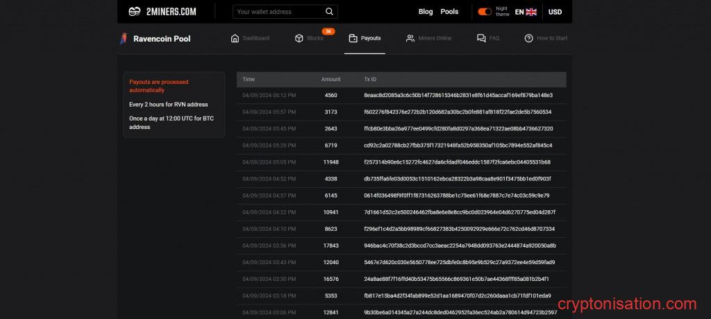 - На адреса в монете майнинга (например, добываем RVN и выводим в RVN), вывод происходит каждые 2 часа. При этом для успешного вывода необходимо достичь установленного для монеты лимита на вывод. Если лимит не достигнут, то пул попробует вывести монеты через 2 часа;