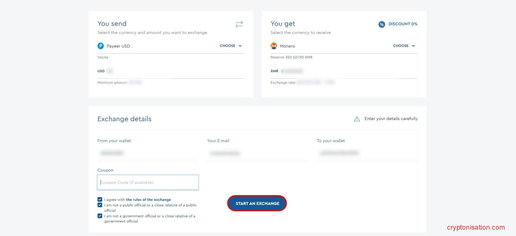 - Wprowadź dane portfela nadawcy, e-mail oraz adres portfela-adresata → Start an exchange;