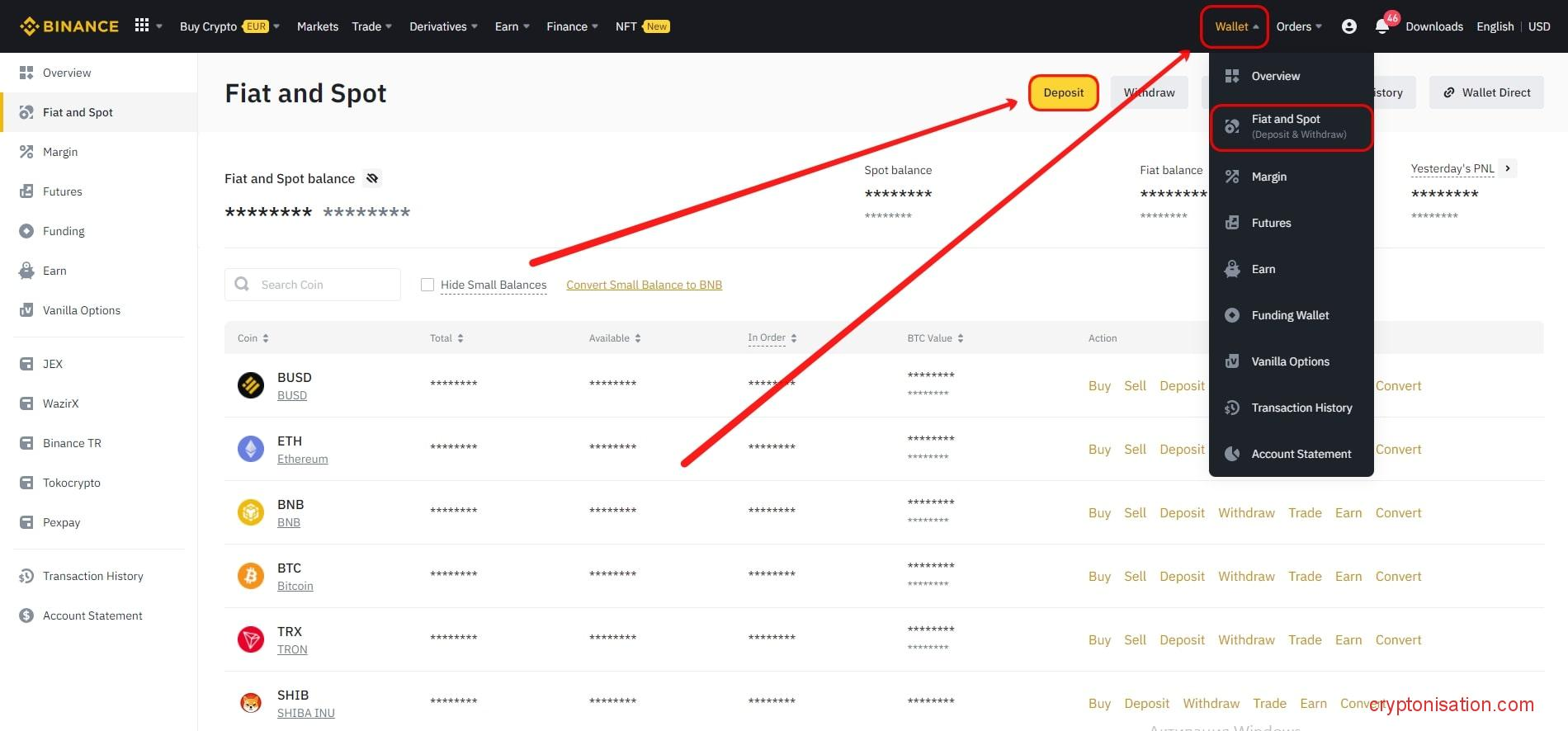 - Kliknij Wallet → wybierz Fiat and Spot;