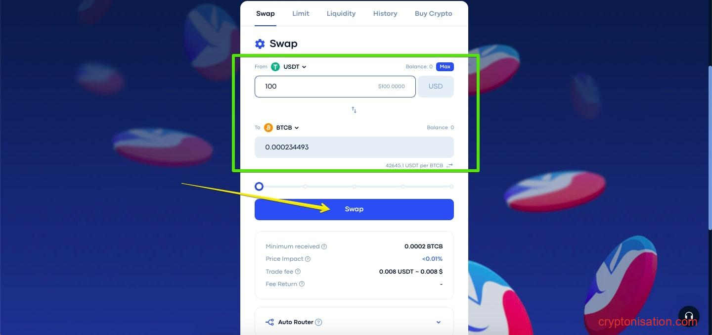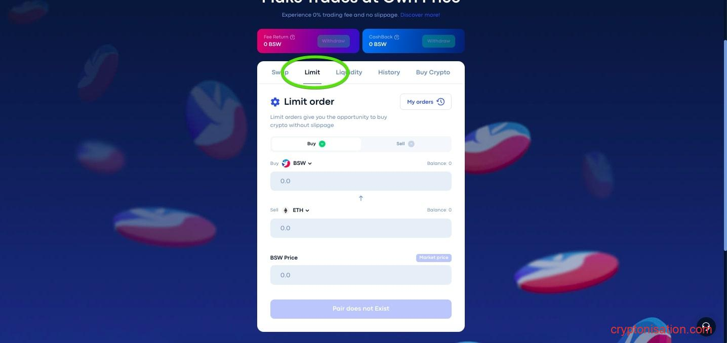 Funkcja Swap giełdy umożliwia handel na rynku spot poprzez składanie zleceń rynkowych, co oznacza kupno lub sprzedaż kryptowaluty po aktualnej cenie rynkowej. Użytkownicy Biswap mogą również dokonywać transakcji na rynku spot przy użyciu zleceń limitowanych. Składając dyspozycję kupna lub sprzedaży aktywów, wstępnie ustalają cenę transakcji.