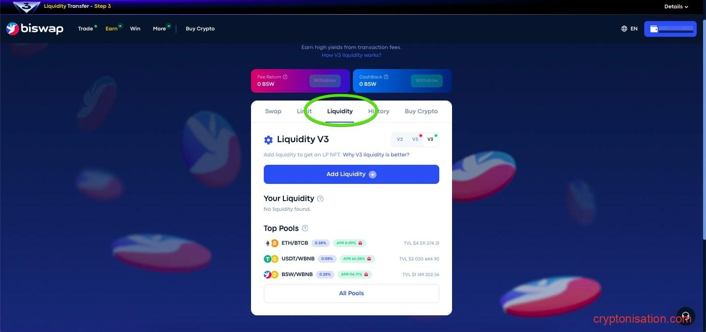 Na Biswap dostępne są pule płynności w wersji 2 (V2) i wersji 3 (V3). Opłaty za wymianę przy użyciu V2 wynoszą 0.2% lub 0.1% (pary BUSD-USDT, USDC-USDT i DAI-USDT).