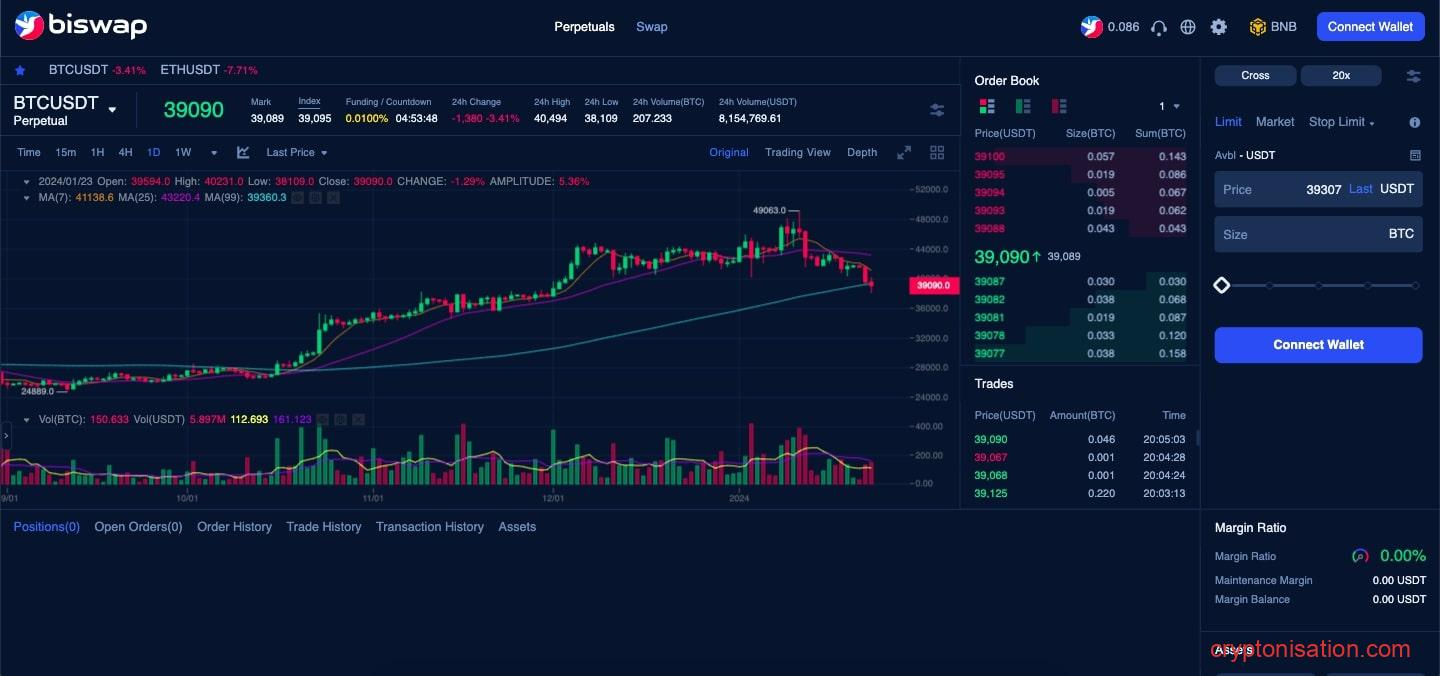 Również na platformie Biswap dostępny jest handel kontraktami futures (Perpetual Trading). Jest to forma handlu kryptowalutami, w której inwestorzy spekulują na ruchach cen bez posiadania samych aktywów. Zamiast tego wykorzystywane są kontrakty wieczyste, które są rozliczane w kryptowalucie i pozwalają inwestorom czerpać zyski ze zmienności cen, dając im możliwość otwierania pozycji na wzrost lub spadek rynku.