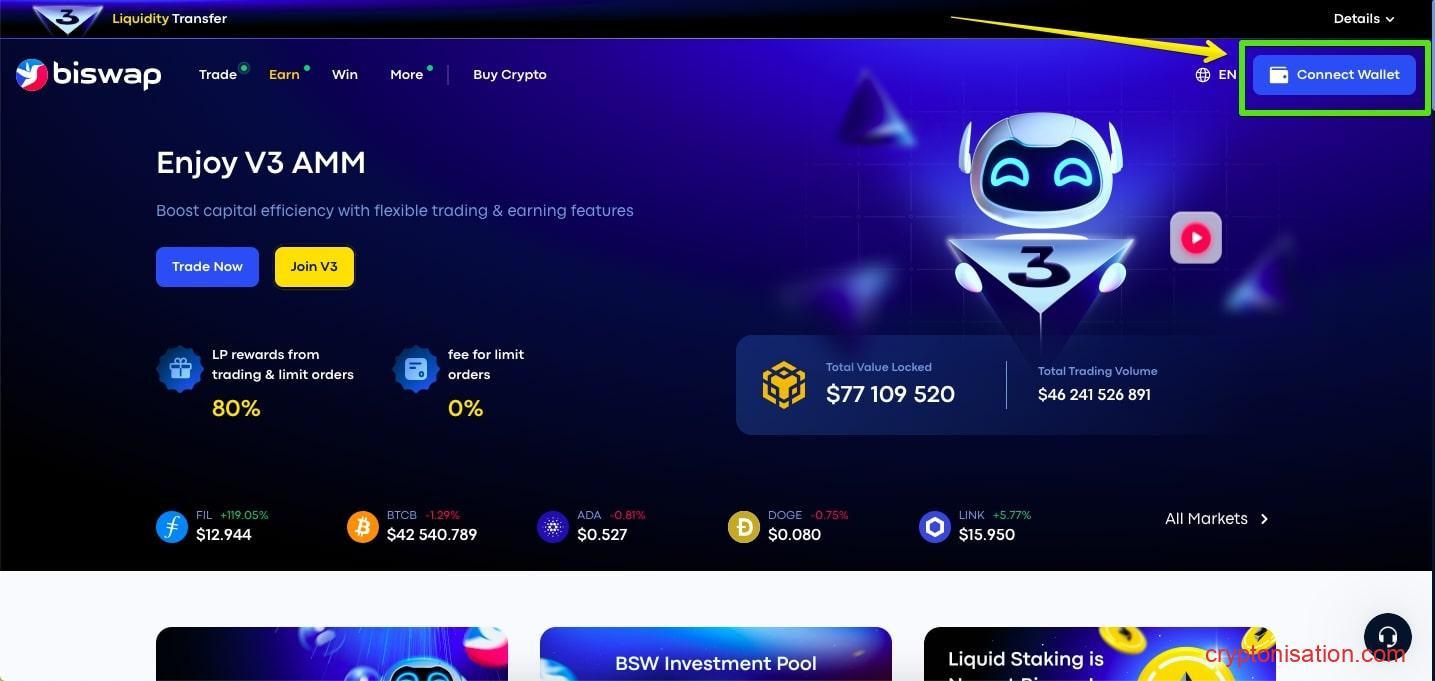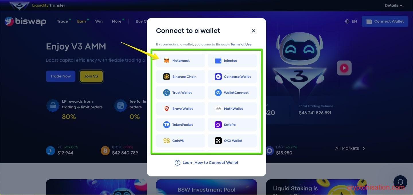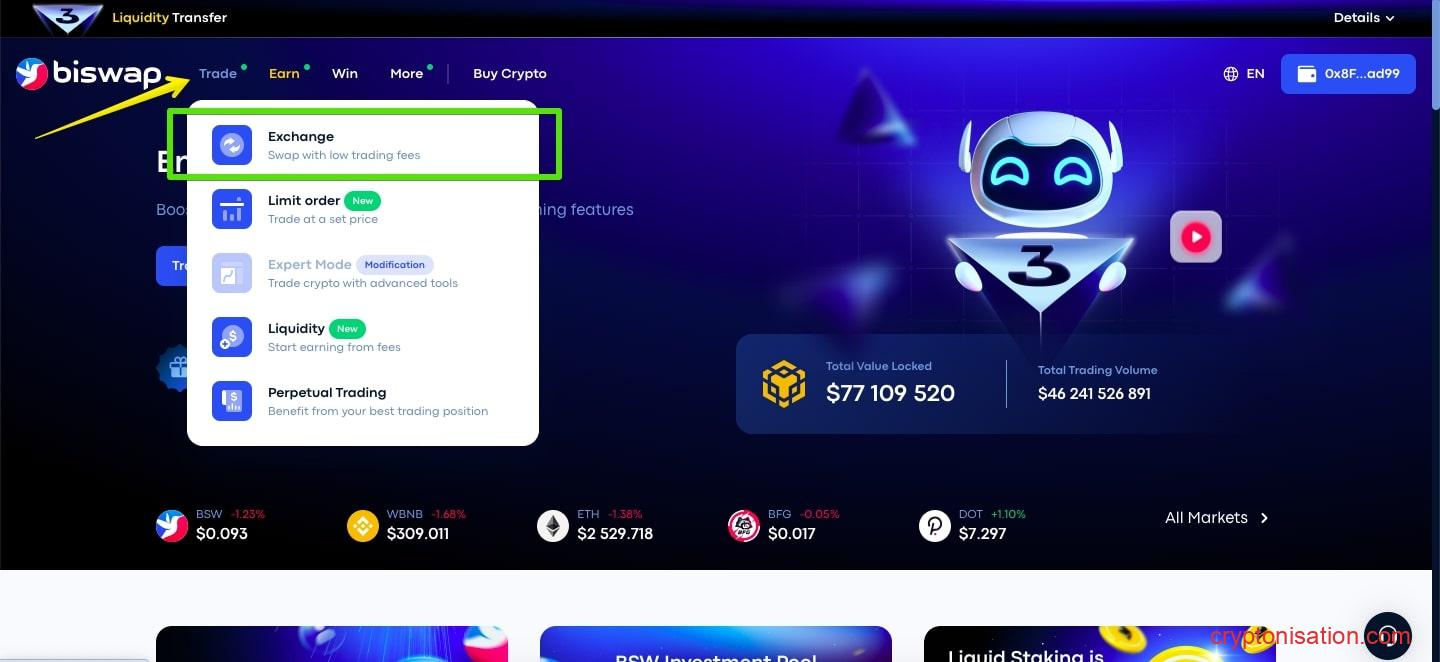 Interakcja z Biswap rozpoczyna się od integracji portfela kryptowalutowego z giełdą. Następnie użytkownik otrzymuje możliwość przeprowadzania zarówno kupna, jak i sprzedaży różnych aktywów.