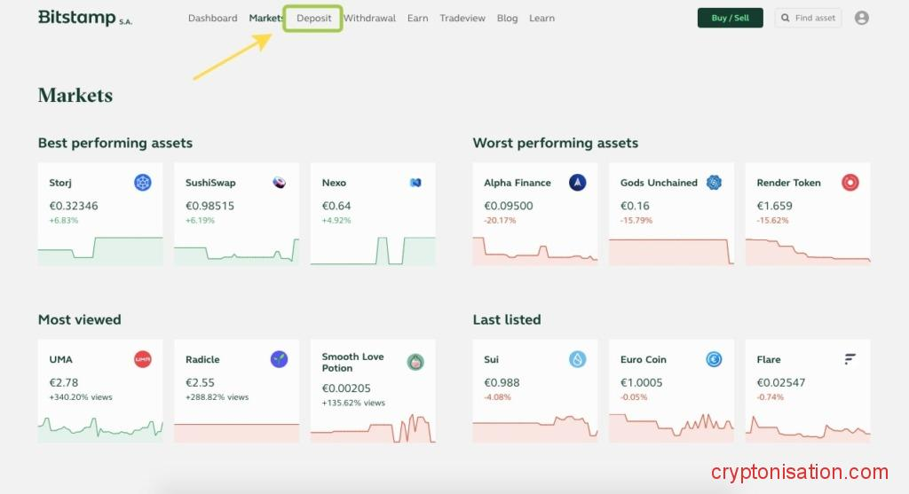 Wpłata na Bitstamp jest możliwa w kryptowalucie i walutach fiducjarnych (przelewem bankowym). Aby dokonać wpłaty, należy wybrać wkładkę Deposit, wybrać metodę wpłaty i utworzyć wniosek o wpłatę.