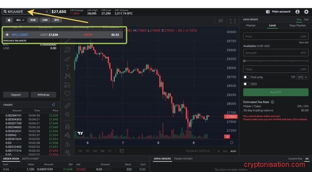 - Wybierz parę handlową BTC/USDT w lewym górnym rogu;