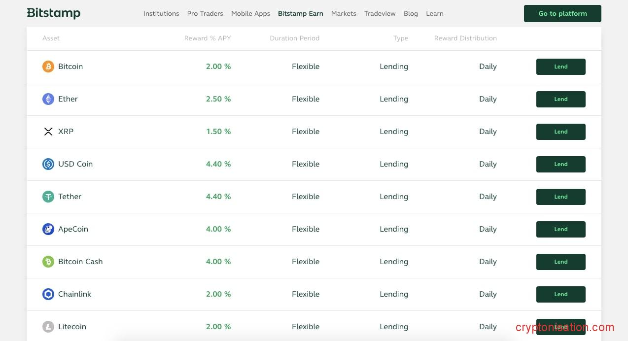 Do dyspozycji na Bitstamp są Bitcoin, Ether, XRP, USD Coin, Tether, ApeCoin, Bitcoin Cash, ChainLink, Litecoin. Roczny zwrot zależy od kryptowaluty i wynosi od 1.5% do 4.4%.