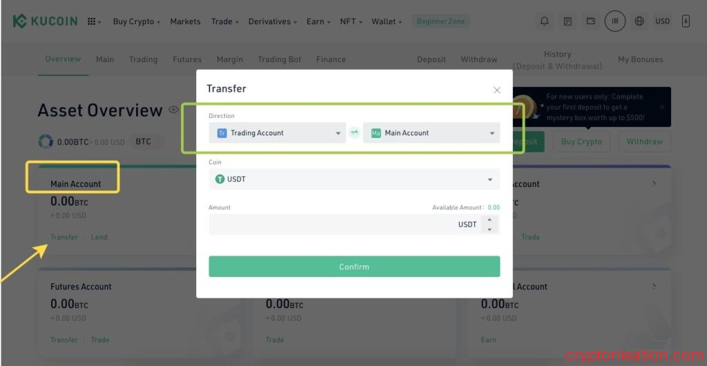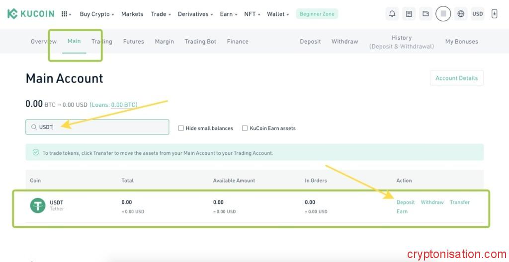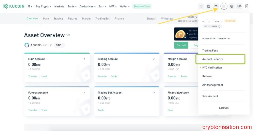 Portfel użytkownika Kucoin - Portfel otworzy się w zakładce Overview. Aby wypłacić środki z konta głównego, przejdź do Main;
